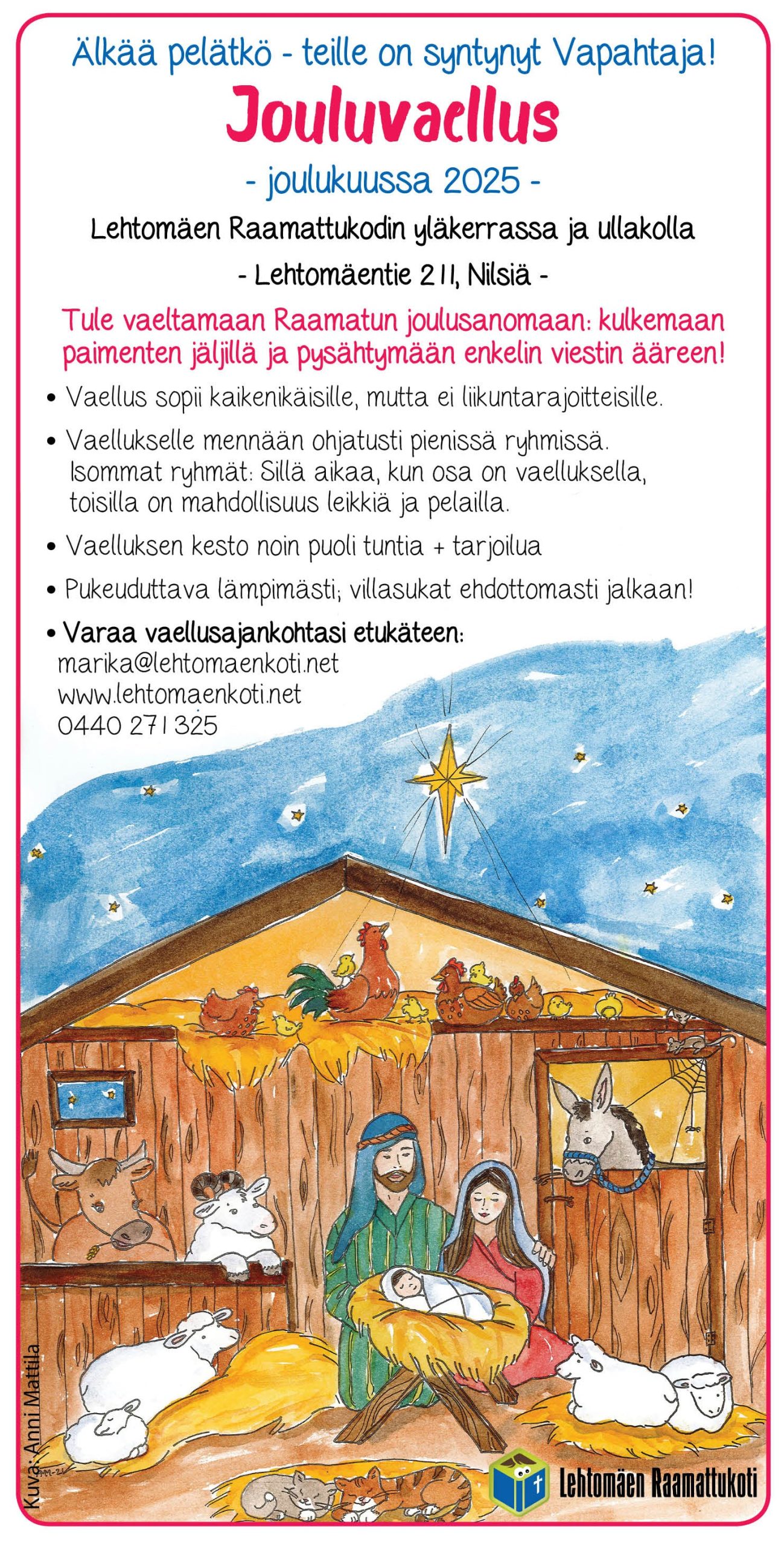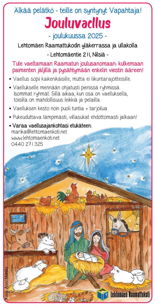Jouluvaellus Nilsiässä20 marras, 2025 in Ajankohtaista kirjoittajalta Marika Huusko (muokattu 26.11.2025) Tervetuloa jouluvaellukselle luokseni Nilsiään! Muista varata vaellusajankohtasi etukäteen: laita viestiä 044 0271 325 tai alla olevalla lomakkeella. Nimi Sähköposti Viesti